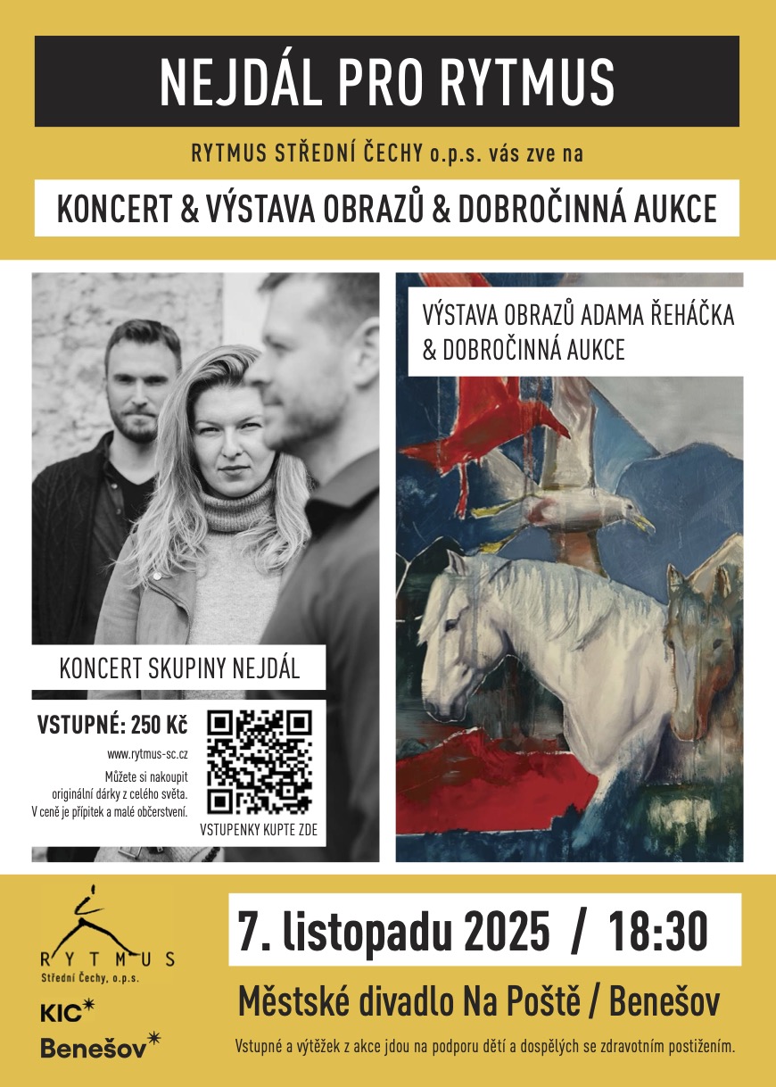 Srdečně Vás zveme na benefiční večer plný hudby, umění a dobré nálady. Čeká Vás výjimečná akce, která spojí výtvarné umění, hudbu a umění pomáhat. V divadle Na Poště se rozezní tóny skupiny Nejdál – hudebního projektu s originální energií a příběhem – a zároveň budete mít možnost obdivovat obrazy Adama Řeháčka (adamrehacek.art).