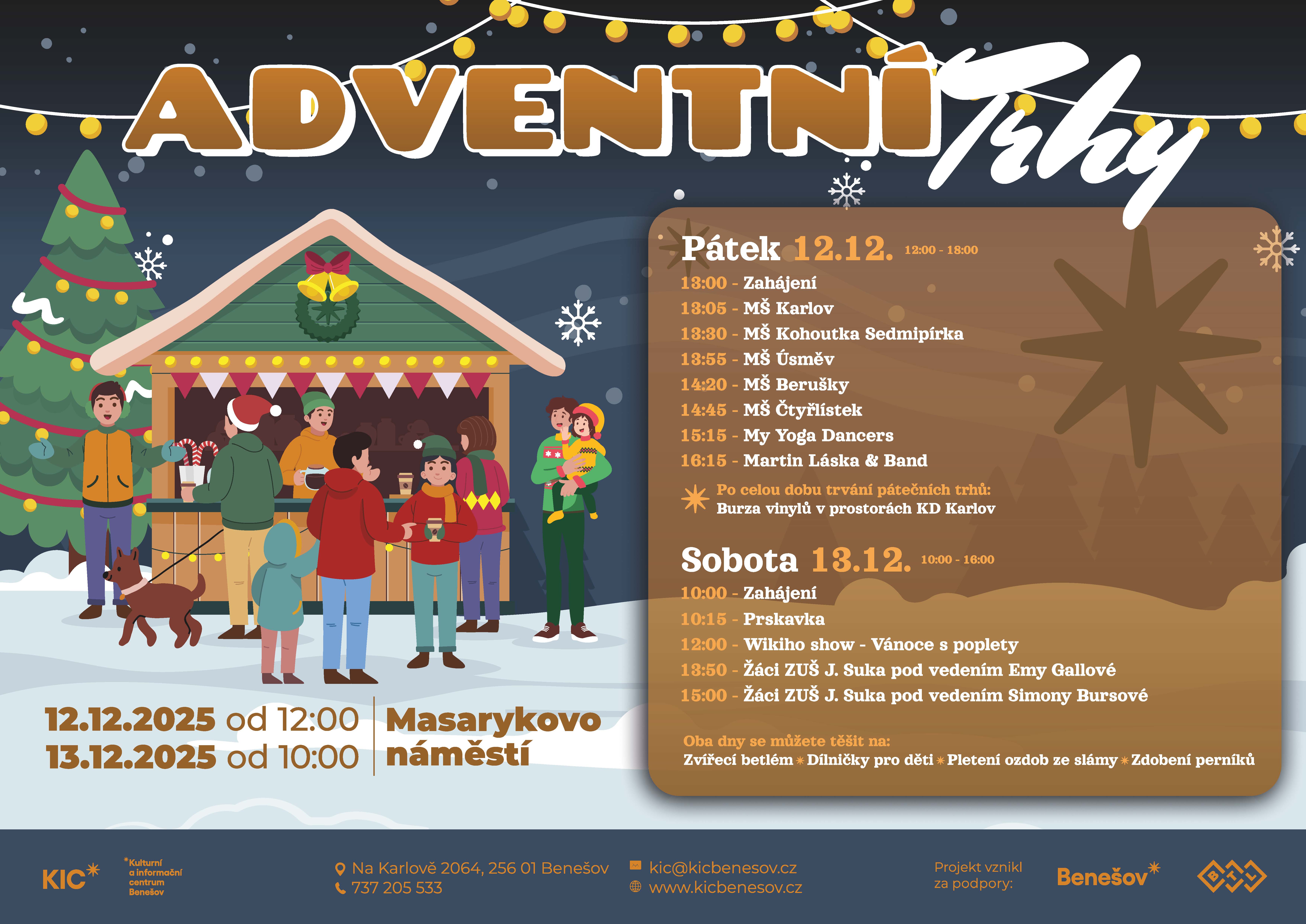 12. a 13. prosince si budou moci návštěvníci i obyvatelé Benešova na Masarykově náměstí užít adventní trhy, kde na ně čeká rozmanitá nabídka rukodělných výrobků, vánočních specialit a bohatý kulturní program. V pátek 12. prosince od 13.00 do 15.00 hod. vystoupí předškoláci z benešovských mateřských škol, po nichž naváží My Yoga Dancers a koncert Martina Lásky s kapelou. V pátek bude také paralelně probíhat v prostorách KD Karlov Burza vinylů.