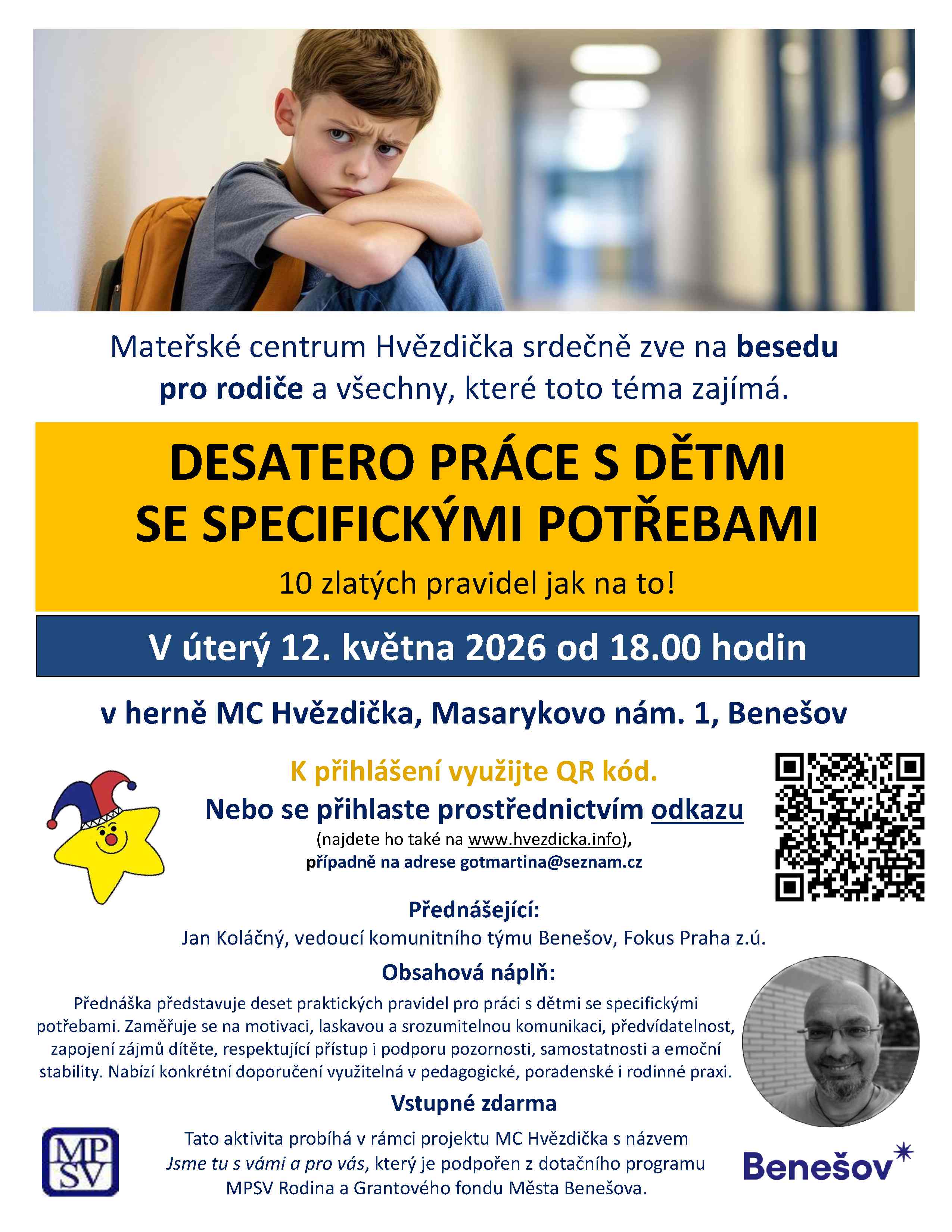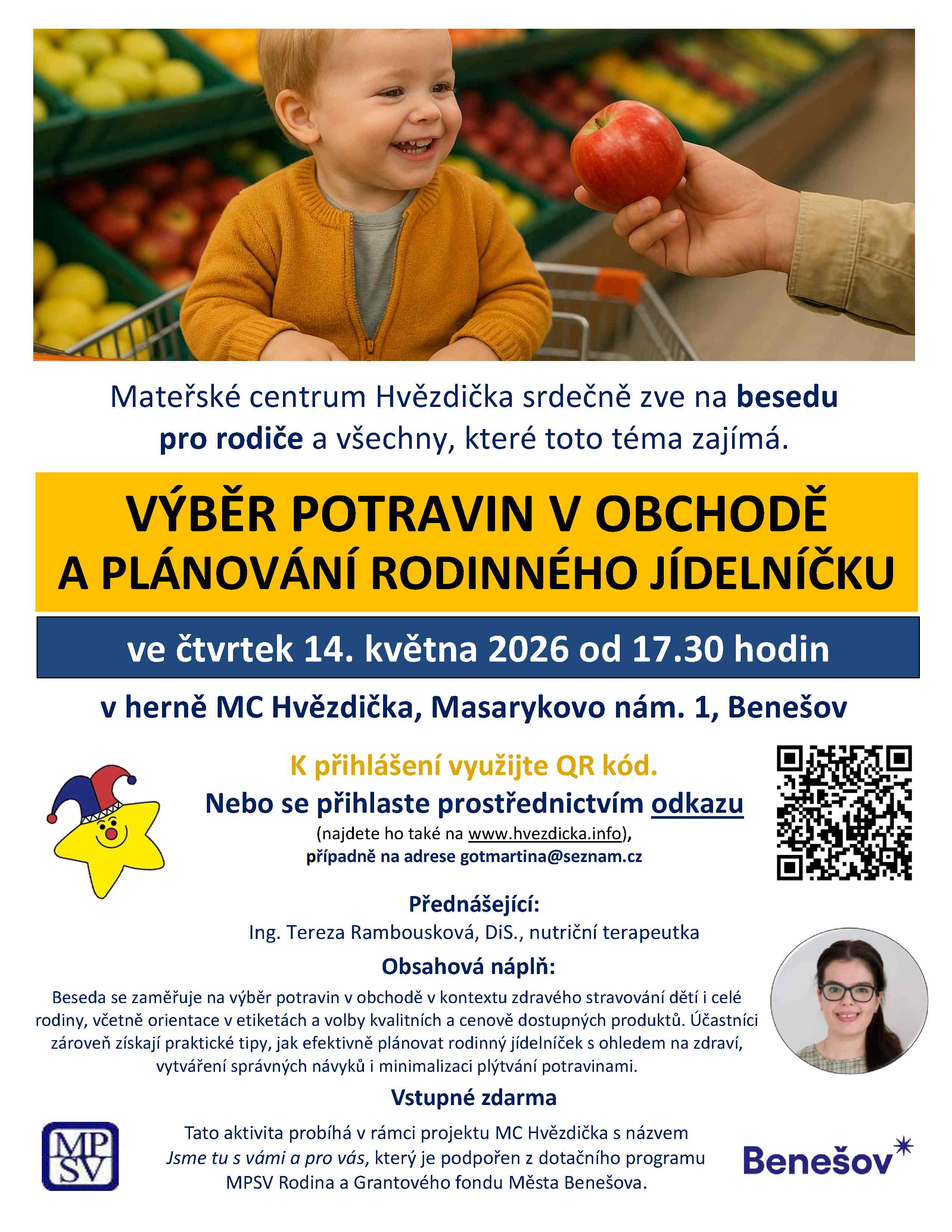V květnu v úterý 12. a ve čtvrtek 14. se můžete těšit na dvě další nové besedy. První „Desatero práce s dětmi se specifickými potřebami, 10 zlatých pravidel, jak na to“. Přednášejícím bude vedoucí komunitního týmu v Benešově a Fokus Praha z.ú. Jan Koláčný. Druhá „Zdravé stravování dětí i celé rodiny, výběr potravin v obchodě a plánování zdravého jídelníčku.“ Přednášející Ing. Tereza Rambousková, Dis. Nutriční terapeutka.